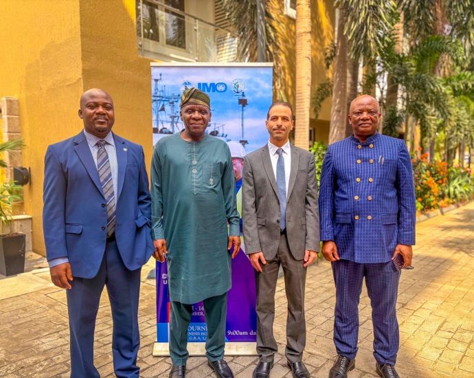 R-L: Comrade Francis Bunu (MWUN President-General); Mr. Emmanuel Nosakhare Igbinosun (Rep. Minister of Labour & Employment); Dr. Dayo Mobereola (DG, NIMASA / Rep. Minister of Marine & Blue Economy); and Engr. Ibrahim Abba Umar (ED, Engineering & Technical Services, NPA) during the 2025 Day of the Dockworker celebration in Lagos.Continue Reading