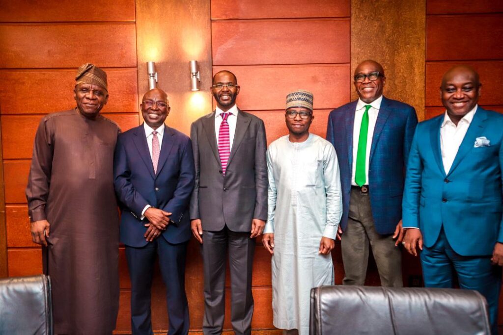 L-R: Executive Director Operations, Nigerian Maritime Administration and Safety Agency NIMASA, Engr. Fatai Taiye Adeyemi; Director General, NIMASA Dr. Dayo Mobereola; NIMASA Board Chairman Hon. Yusuf Hamisu Abubakar; Executive Director, Maritime Labour and Cabotage Services NIMASA, Mr. Jibril Abba; Executive Director, Finance and Administration, NIMASA, Mr. Chudi Offodile and a NIMASA Board Member, Mr. Babatunde Bombata, during the Board’s inaugural meeting in Lagos.