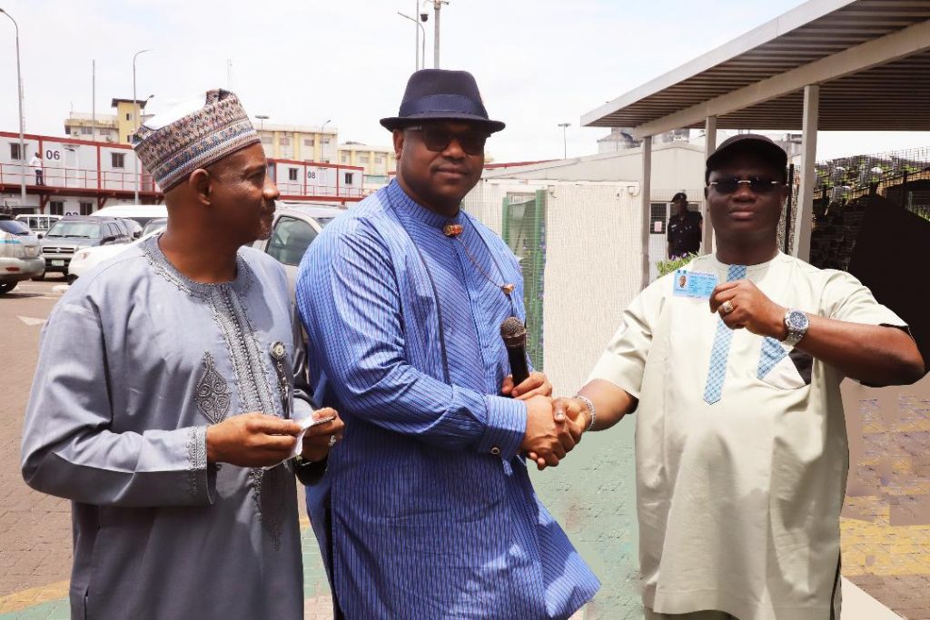 Executive Director, Maritime Labour and Cabotage Services, Nigerian Maritime Administration and Safety Agency (NIMASA), Engr. Victor Ochei (middle) presenting a Biometric Identity Card to the President General, Maritime Workers’ Union (MWUN), Comrade Adewale Adeyanju (right) while the Head, Maritime Labour Services NIMASA, Aliyu Lawan looks on during the Official Flag-Off Ceremony of Maritime Labour e-Registration Platform and Issuance of Biometric Identity Cards to Dockworkers in Lagos