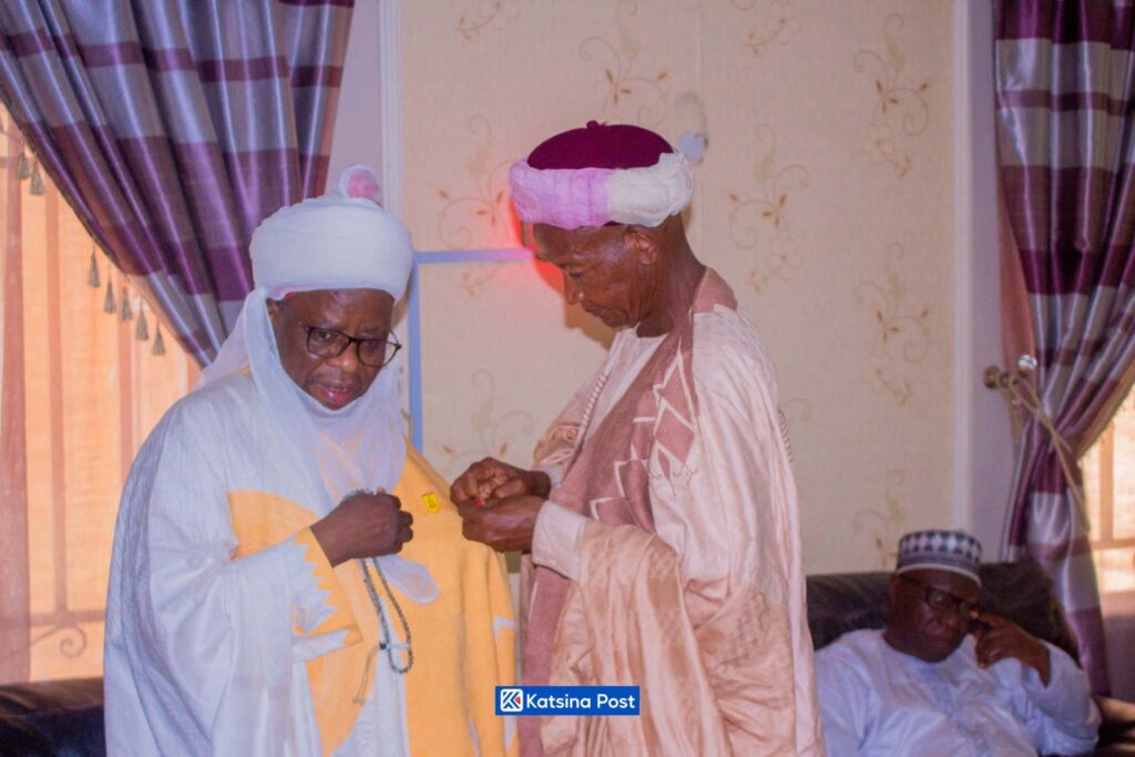 Kanwan Katsina Alhaji Usman Bello Kankara being decorated with the NIPR badge as a Fellow of Nigerian Institute of Public Relations by the chairman of ANIR Katsina State Chapter